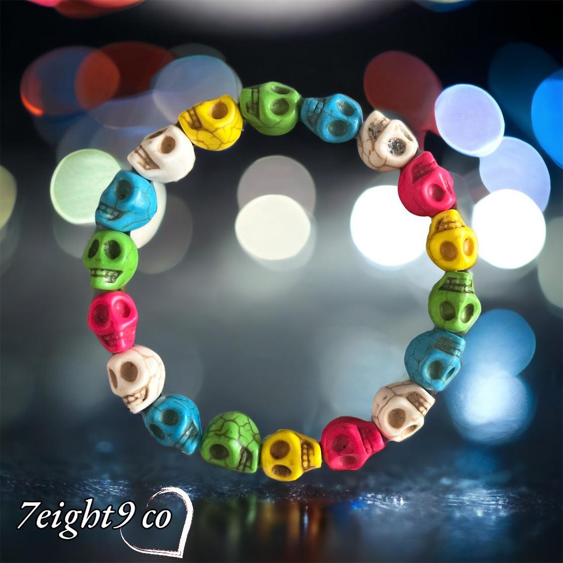 Brighten up your look with this multi-colored turquoise skull bracelet. Perfect for adding a fun, quirky touch to any outfit. From a subtle flash of color to a bold statement of style, the days of dreary jewelry are dead and gone! 💀