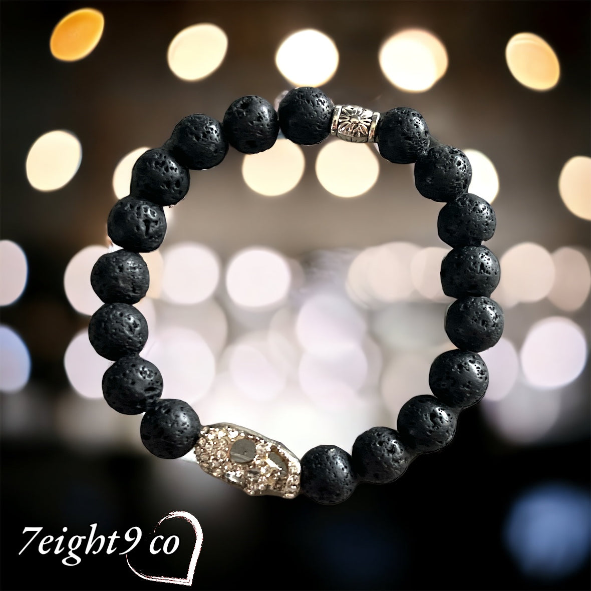 This one-of-a-kind accessory sparkles with spooky style! The Rhinestone Skull Bracelet features a detailed skull adorned with shiny rhinestones, perfectly perched on an elastic string of black lava beads. Add some bling to your wrist - skulls allowed!